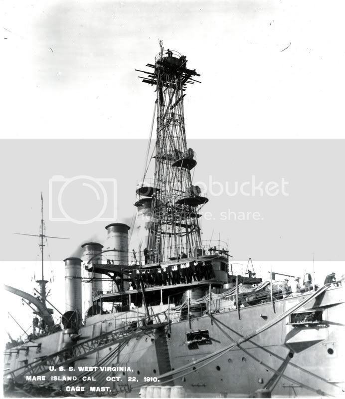 Here is a picture of the USS Virginia shown at Mare Island on the 22nd of October 1910 after installation of caged masts.