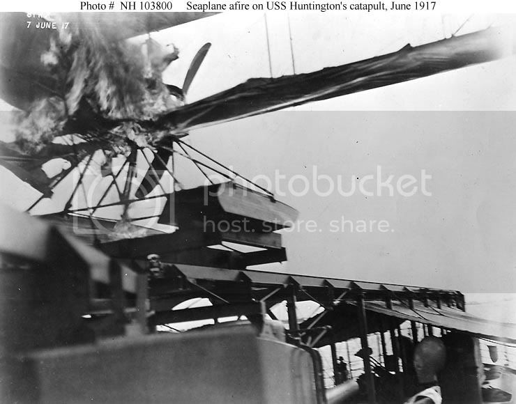 A picture of a Martin Thomas seaplane on fire on the ships catapult 7 June 1917.