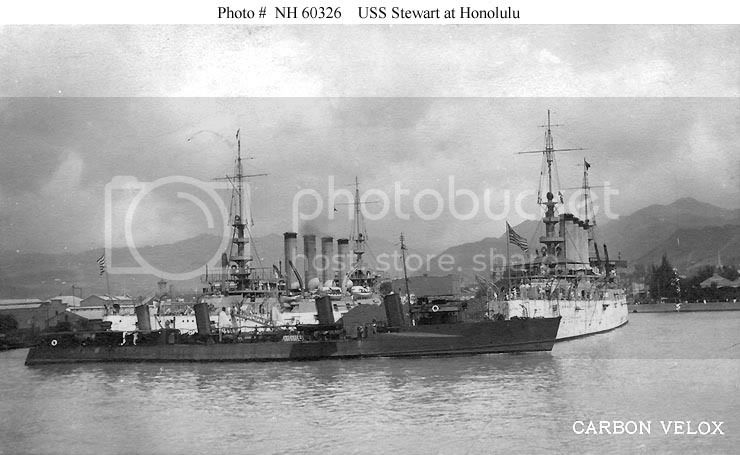 This is a picture of the USS Stewart underway in Honolulu Harbour, Hawaii circa 1908 with the USS Virginia in the background at left.