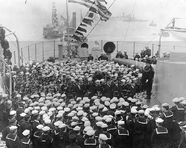 President Theodore Roosevelt addressing officers and men onboard U.S.S Connecticut (BB-18) at Hampton Roads, Virginia, after cruise around the world by the Great White Fleet, 1909.
