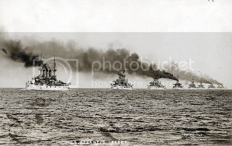 Having crossed the Atlantic, the Great White Fleet arrived at Hampton Roads, Va., on a rainy February the 22nd, 1909, ending its fourteen month odyssey. Steaming into the Roads, the ships, looking not quite as white as when they started out, but majestic nonetheless, had their bands belt out the rollicking tune "Strike Up The Band," followed by the slower, more poignant strains of "There's No Place Like Home."