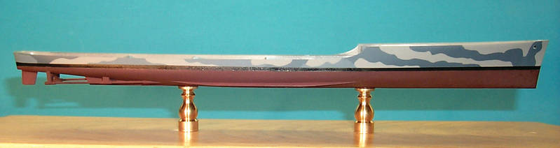 July 19:  Finished the boot topping and decided to go ahead an mate the two parts of the hull.  I put some epoxy around the nuts in the upper hull section in case I need to take the lamp risers out at some point - hope the epoxy stayed on the outside of the nuts.  Here is a photo of the starboard side - I modeled the camouflage pattern on the photo of Ellyson in Steve Wiper's book on the Benson/Gleaves class.  That photo looks like it must be from about the same time as the photo I have of the port side (posted above).  I used black as opposed to flat black paint for the boot topping - it will tone done somewhat when I apply some clear flat after getting the hull markings on.