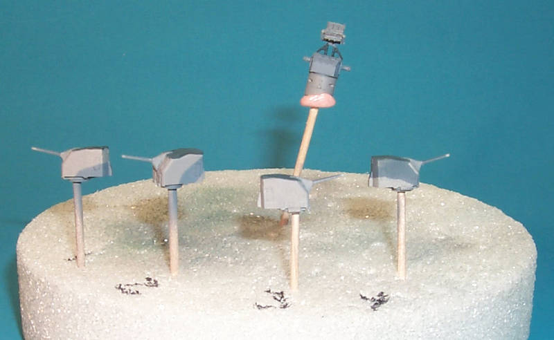I've also been doing a lot of pre-painting. I'm coating most everything with haze gray before getting the detail parts assembled. I'm pretty much done with the 5" guns, however. Again, I used the photos to guide the camouflage pattern. I plan on coating them with Future and then a applying a light wash to bring out the nicely molded detail. Here they are as of this morning.