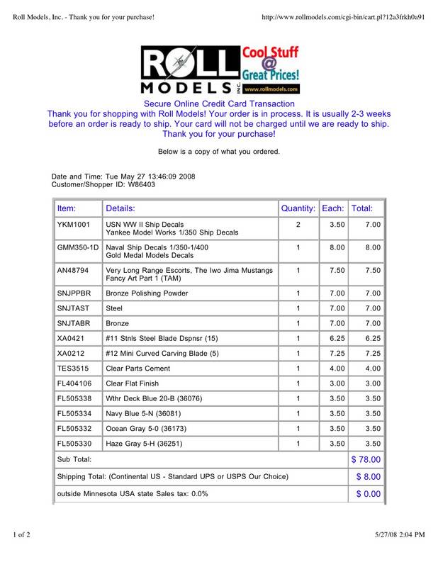 This being my first surface ship model in about 50 years, I didn't have the proper paint on hand, nor did my LHS - so I ordered some along with decals to use for the ship's numerals. Here is a copy of the order (which included stuff for other planned builds).