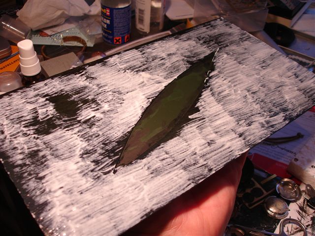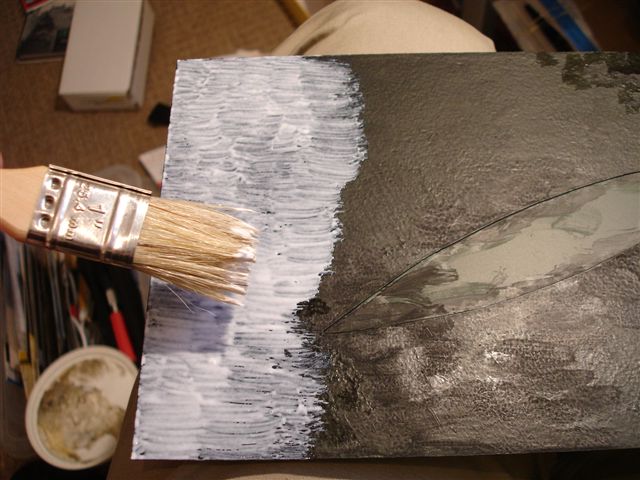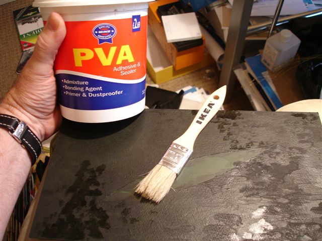Continuing, I now fix the base with pva glue. One generous coat sets the whole base, and can be used as a finish. I will normally use a second coat, or use polyurethane for an even glossier finish to suit the subject and mood.
