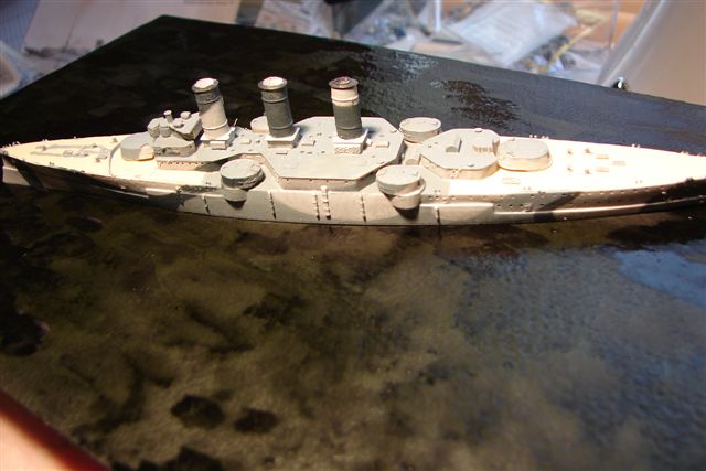 I will show the ship at anchor, in which case I will not need to white dry brush the bow wave and screw churning effect.