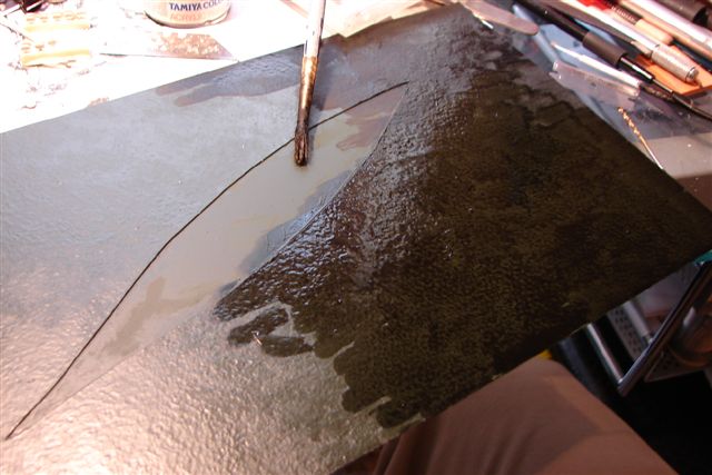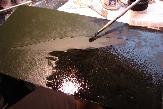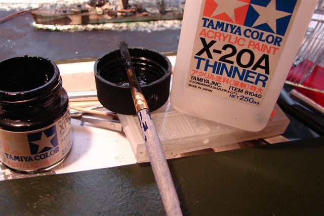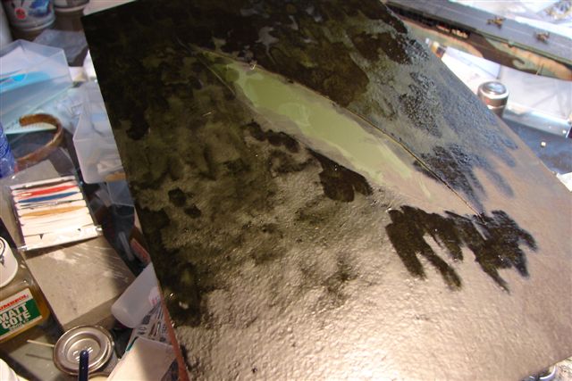 The Tamiya paint cleaner is used to make a light wash with the black paint. This gives the green a more mottled look and gets away from the "billiard table effect" of an overall green.