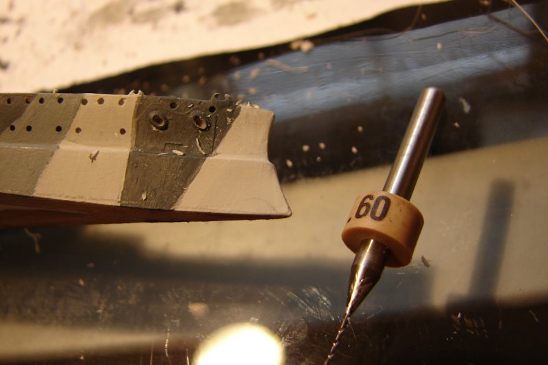 This is something I don't have to be at the bench for, however to keep it all in context for this demonstration, I continue with the drilling out the funnels, port holes, and anchors eyelets on the bow.