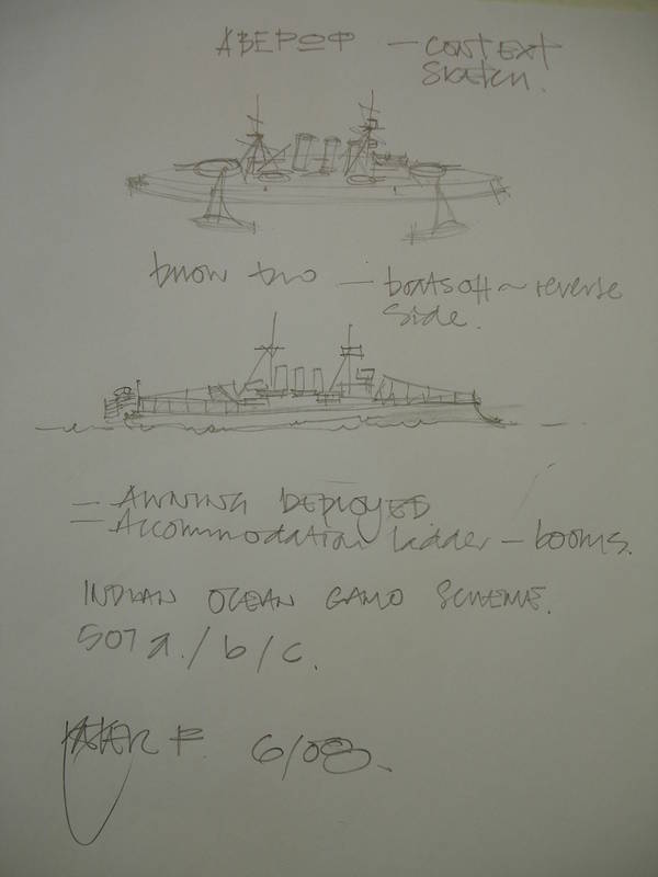 So, a little sketch around gives me some ideas as to how the scheme will be presented. I can imagine a very hot day with Averoff at anchor in a very still sea. The awnings are either in place or being deployed and there are three or four dhows in the water around the anchorage either coming