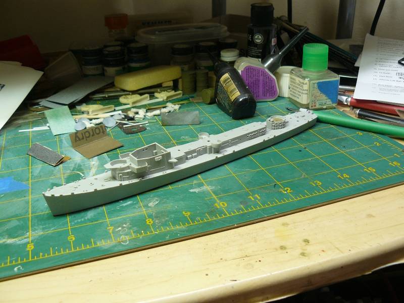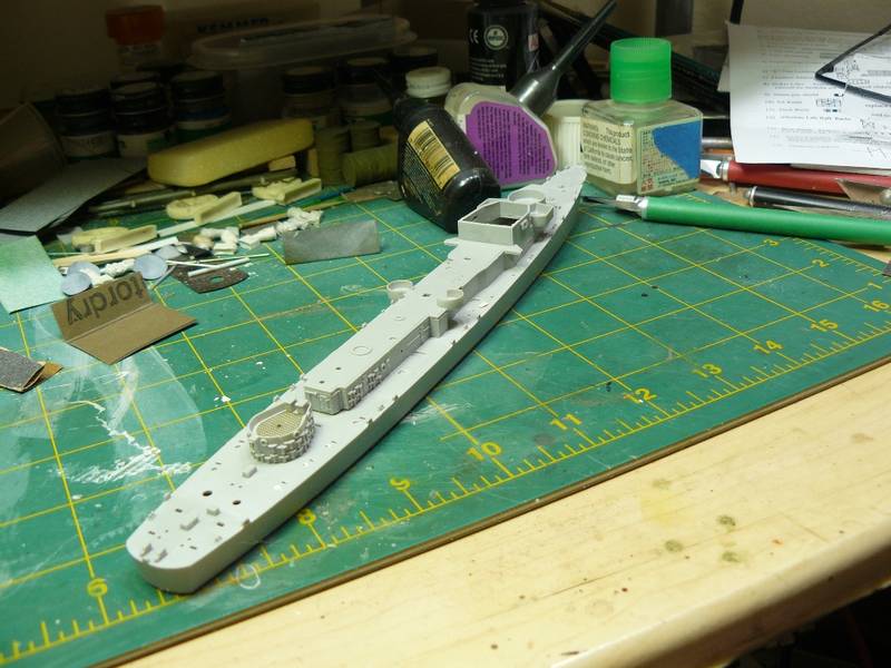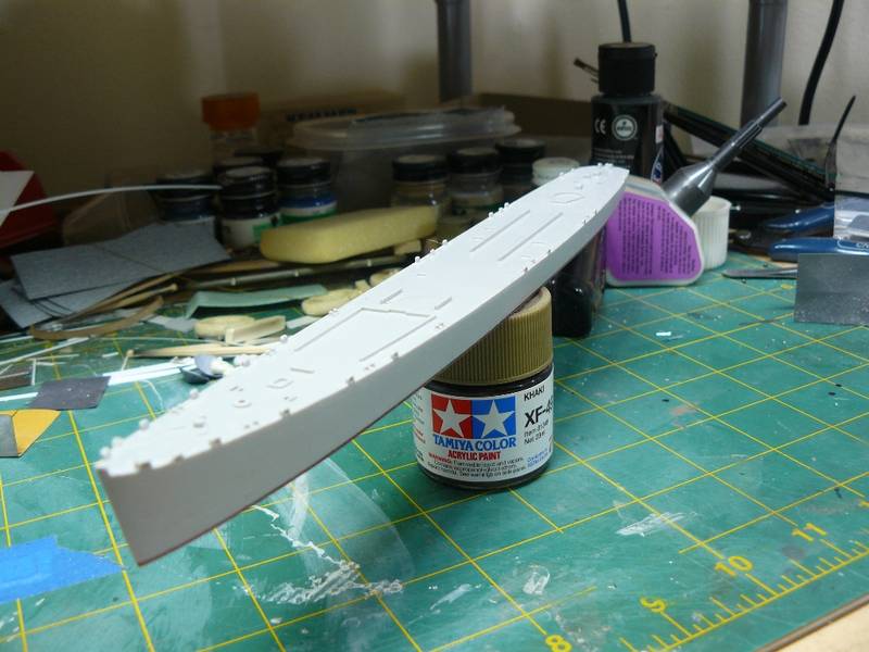 OK, managed to get a little more done, I realized I needed to do some filling of holes etc on the deck for the photo etched parts, so spent some time filling and sanding the holes. (Next time it would probably be easier to do this before attaching the deck to the hull, so I could back up the filler with tape or some plastic card)