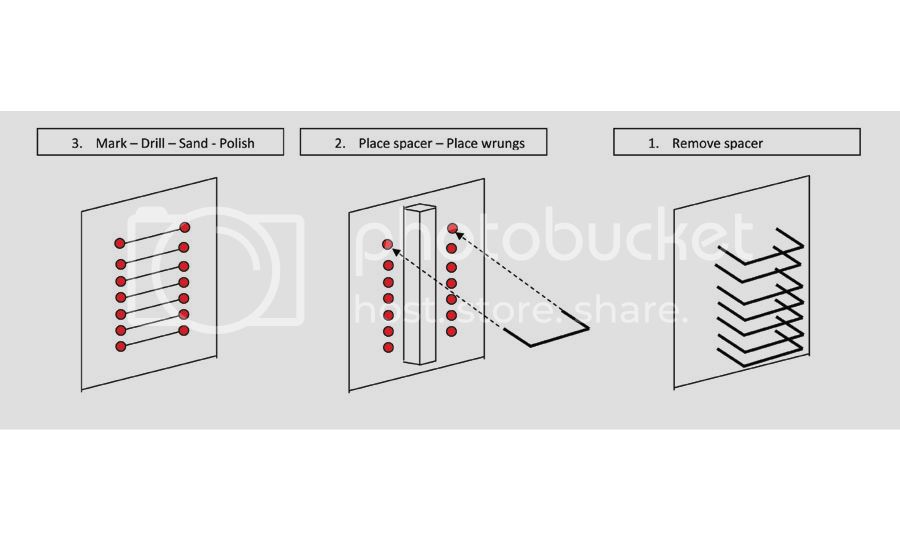 I use a needle to make an indentation at the rung's ends. Take a pin wise to drill holes on each end of the rungs. The hole should fit the brass rod you'll be using for rungs. If the alignment of all holes in 2 (almost) straight lines is good I sand away the plastic rungs and polish the surface.
