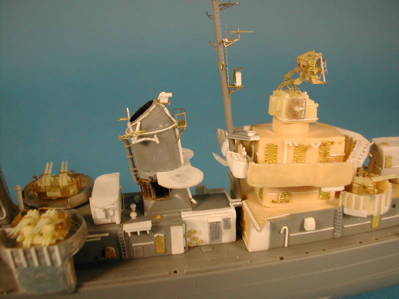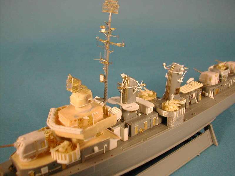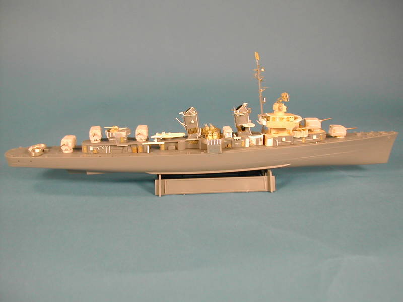I figured since there was no way I'd be finished by the dealine, that the least I could do was post some in progress shots of my build for the Forgotten Sisters Campaign.  This is a Fletcher Class destroyer, the USS Healy, DD 672.   The kit is the Tamiya Fletcher, which is an early war, round bridge, and naturally, what I wanted was a late war, square bridge, so in addition to over detailing, I've wound up having to do a lot of scratch modifications.  The parts are just set in place at the moment, I'll paint the sub-assemblies before I secure them.   I have quite a few more small items complete (like the twin 20 mms, etc), but I still have to do all the depth charge racks, a ton of painting, finish assembly to include all the railings and then finsh up all the rigging.   I'll also be making a wooden stand and add a brass nameplate.