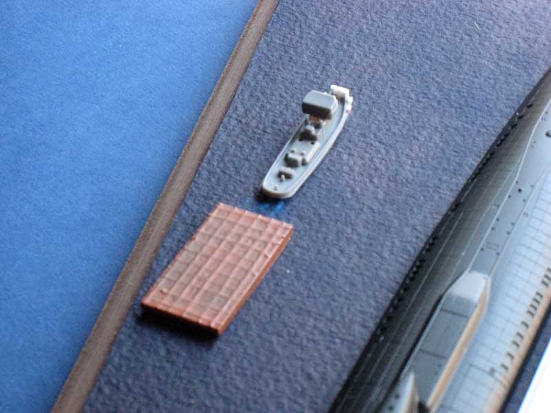 Note the partial pier (scratch built), the old barge (also scratch built) and the modified tug (I though that BFM Tugs were too good to spend this way)