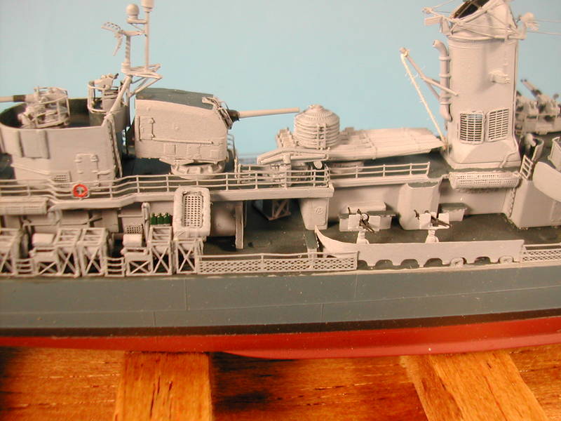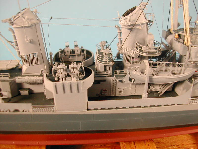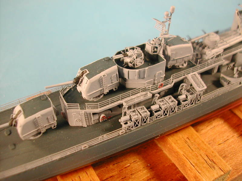 I used the Tom's Model Works Fletcher Conversion kit to get the square bridge, along with quite a bit of scratch building. Alan Raven's "Fletcher Class Destroyers" and Lester Abbey's book of the same title were essential to provide photo references and drawings. The 5" turrets are the Corsair Armada with the late Steve Nutall's brass barrels. Quad and twin 40 mm are the L'Arsenal as well as their Mark 37 Gun director, twin 20mm, life rafts, 26' whale boat, and Mk 51 directors. The anchors and searchlights and torpedo tubes came from Yankee Modelworks. The PE is a combination of Tom's Modelworks and the Gold Medal Models sets.