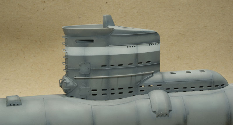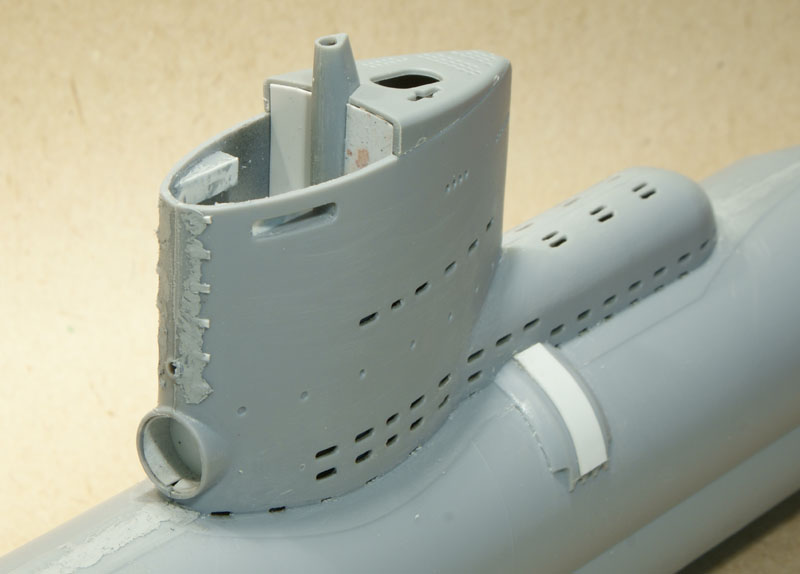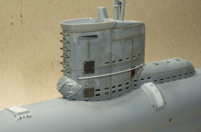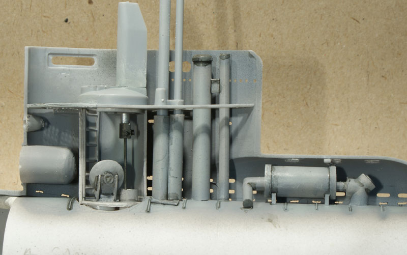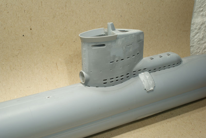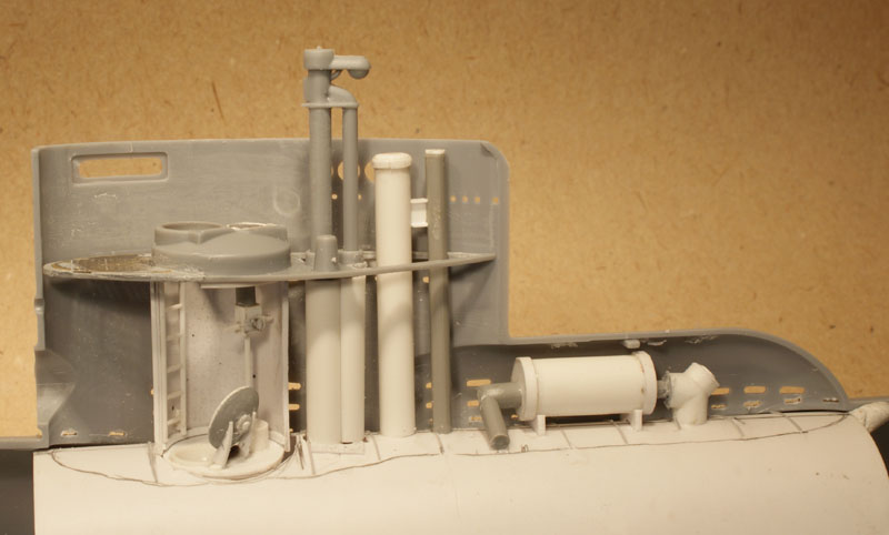 As you can see the exhaust right behind the sail has recieved a strip of styrene to build it a bit up, on this next picture you see it with some putty - the shape is a bit more carracteristic that the kits details. I have allso filled and sanded the holes in front of the sail for the stairs, I“m going to replace the kit parts with some homebent wire.