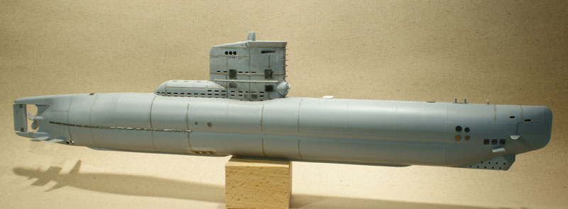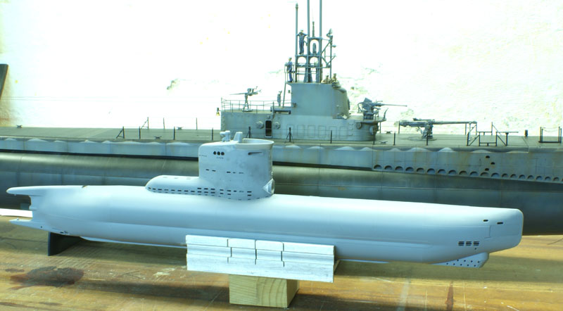 Here it is besides my Gato, allmost looks like a midget sub in comparrison - you might just be able to see that I have begun building op the shape around to watertight compartmen on front of the sail -