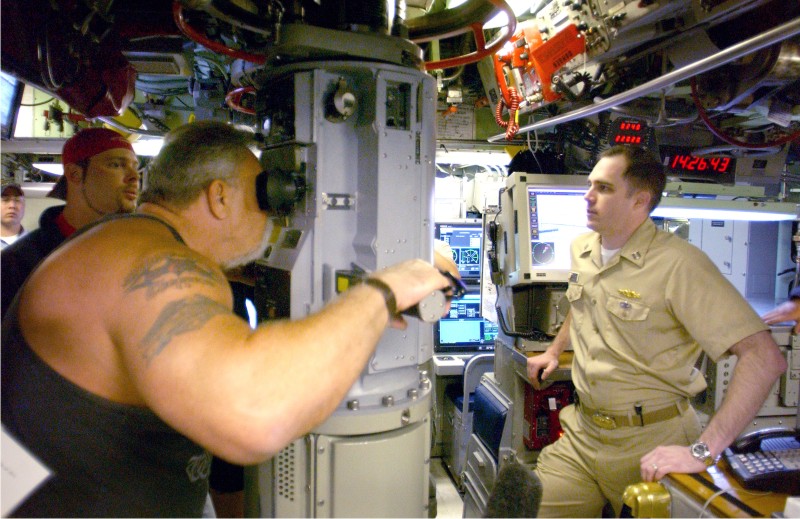 [i]Paul Teutul Sr., of American Chopper, looks through one of USS Albuquerque's (SSN 706) periscopes.