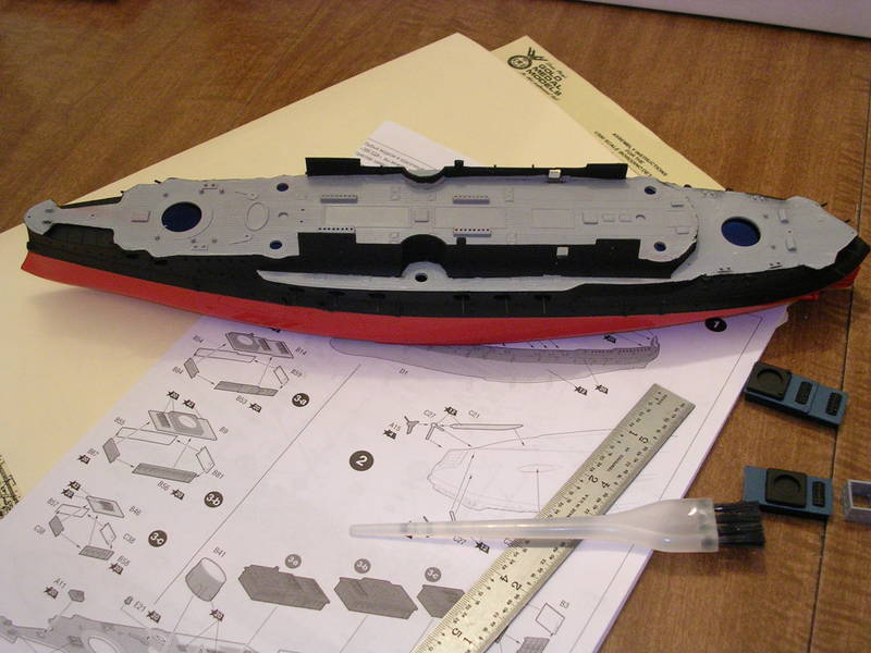 A little more progress to report...hull finished, masked, painted, and have begun on the deck work, deck houses, etc...this kit so far is a good one, minimal fit problems, lotsa fun!  I continue...