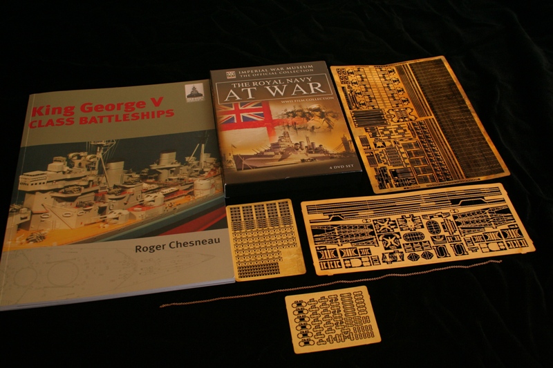 Besides the kit, I've purchased some WEM photo-etched sets, the "Ultimate King George V" photo-etched brass set, RN cable reels, and Fukuya replacement barrels for the 14" and 5.25" armament. Any other additions I'll add as I go.
