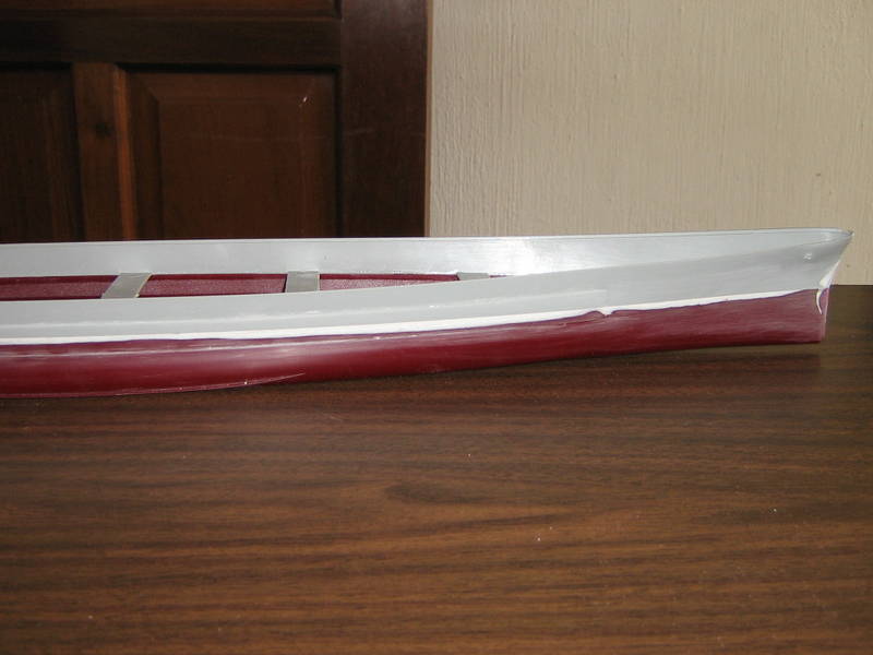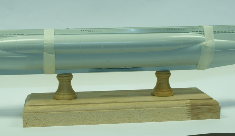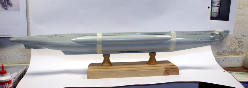 This is the hull, which needed some putty and sanding to make the halves fit right. With CA glue and a little pressure I could have made the lower half conform to the upper one, but that would have caused stress (the strengthening tabs of the top half buckled slightly), so I walked the far easier putty road. Unfortunately, the good liquid model puttys are not sold here, so I had to use Testors blue-tube putty, and that one leaves some imperfections that the paint will not totally hide. Them be the breaks, I guess:
