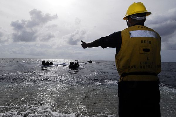 Seaman Bertram Taylor signals the combat rubber raid craft boats, manned by the 31st Marine Expeditionary Unit (MEU), as they approach the well deck of the amphibious dock landing ship USS Harpers Ferry (LSD 49).