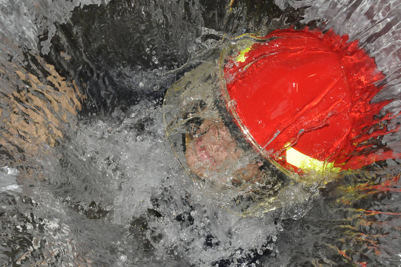 Damage Controlman 2nd Class Ken Wiseman climbs up a flooded hatch during damage control training at the Center of Naval Engineering Learning Site Pearl Harbor.