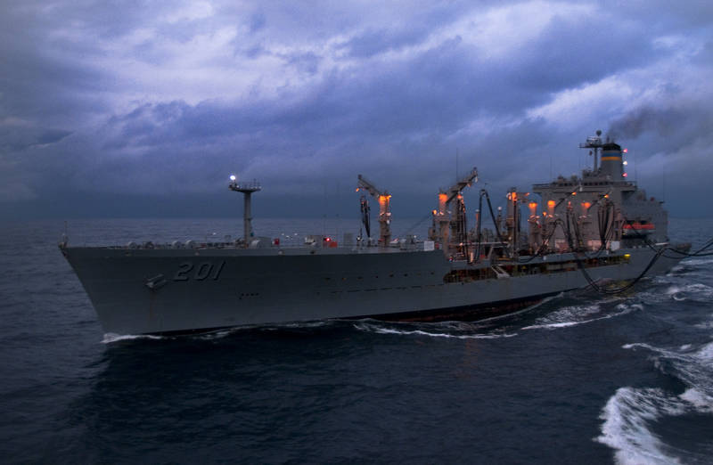 The Military Sealift Command fleet replenishment oiler USNS Patuxent (T-AO 201) arrives to refuel the amphibious assault ship USS Nassau (LHA 4) during a Composite Unit Training Exercise (COMPTUEX).