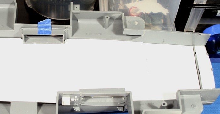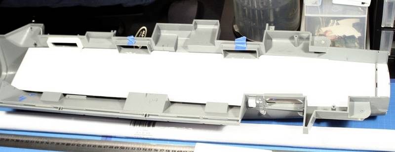 Forward section test fit. You can see a bit of the mid section on the right. The start point of the large blast doors that separate the 2 hangers, have been moved further away from No. 2 elevator...based on new info I acquired.