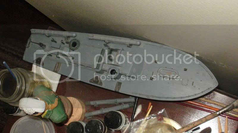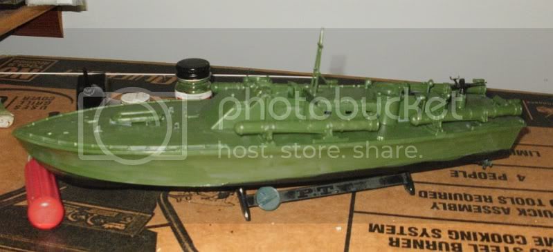 I got a few more little pieces glued  down on the PT boat. Only problem was that my bottle of paint had gone bad. Didn't have any gray paint that looked right so I changed its color to green.