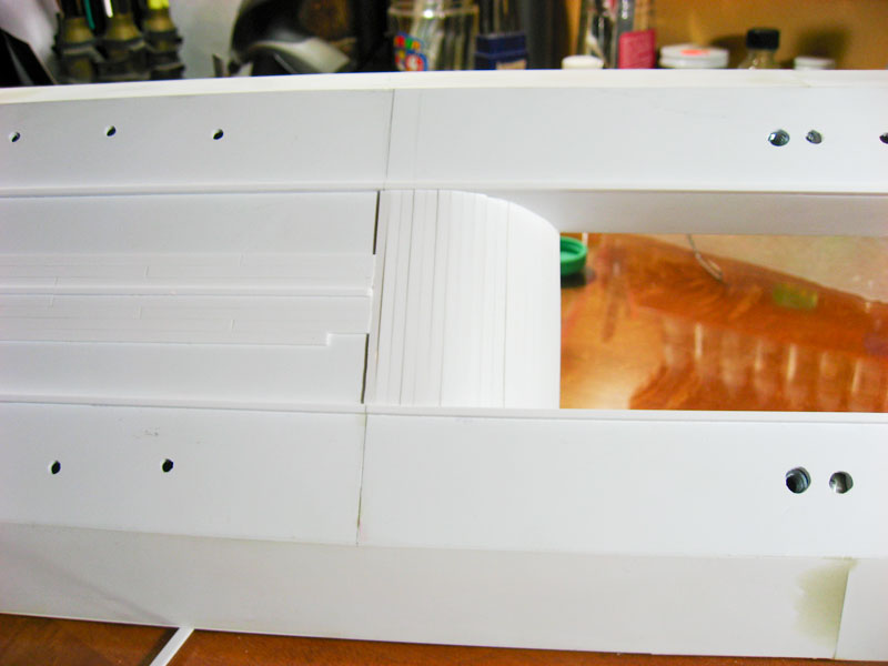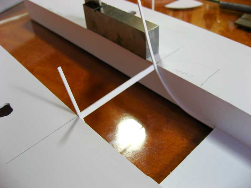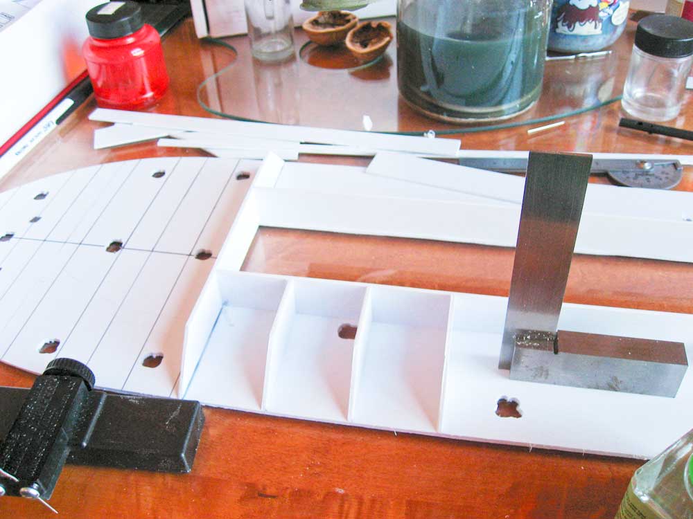 The City Class gunboats hull was completely parallel between the upper and lower levels. Measuring this distance and allowing for thickness of plastic, I came up with a frame height of 21mm. Fortunately, my strip wood/styrene cutter's maximum extension was exactly 21mm. Couldn't have planned it any better.