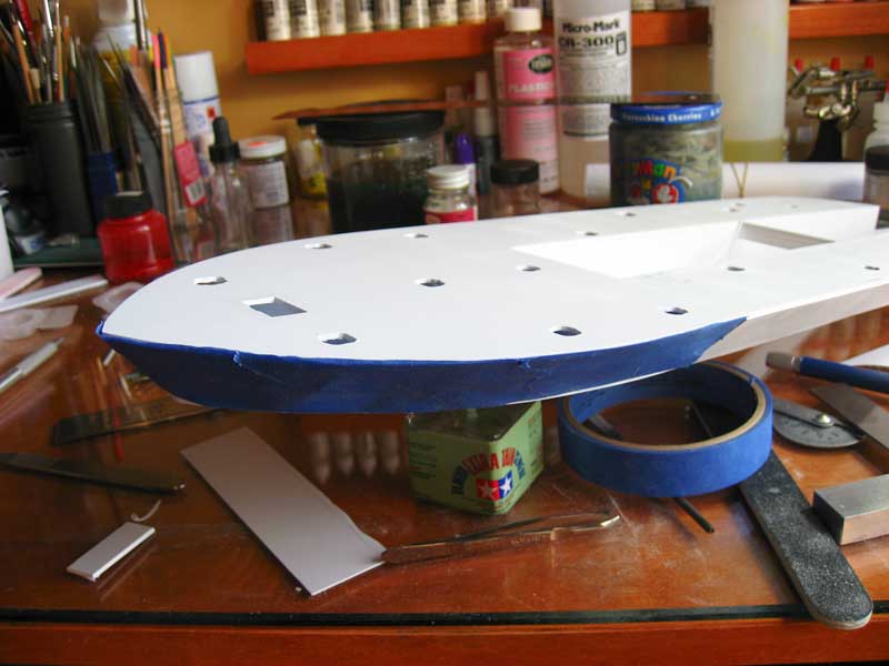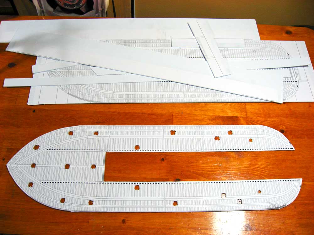 Next comes the cutting. Here's the main deck. The large channel down the middle of it is for the paddle wheel. These City Class boats were of a mid-wheel design, utilizing the casemate and hull thickness for protection of the wheel assembly. The holes drilled in the deck are for the passages down into the lower hull where they stored ammunition, ropes, stores, etc. I drilled them round here because it was easier then cutting square holes in such thick styrene. When I plank the decks these openings will be squared off.