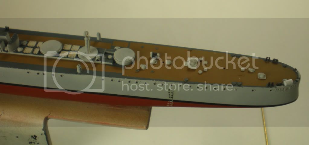 I painted the main deck cortecene brown, masked of the non-skid passages and then added deck grey. After this I installed the deck overhang of the focsle and the wheelhouse. Filling the gap between focsle deck parts took some, but was eventually overcome. Now the forecastle deck was painted in given colours.