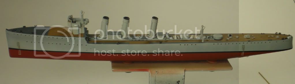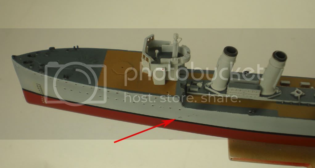 The added name lettering at the stern may be a litte too big and too defined, but I still like the effect. Out of pulled copper wire strands I shaped the eyebrows for the portholes. The eyebrows were fixed with white glue and sealed under two layers of light grey one of which was a bit thinner then the other allowing some shading from the black ground to reach through. That's something the camera can't show, because the effect is ever so faint. (Come to Telford see her live!). All colour coats were White Ensign's, but the black which came from Revell.