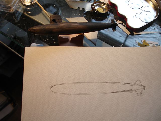 To copy the picture off the box, I have drawn a line around the hull with the pencil at an angle so that the hull peeps through the paper, and as shown.