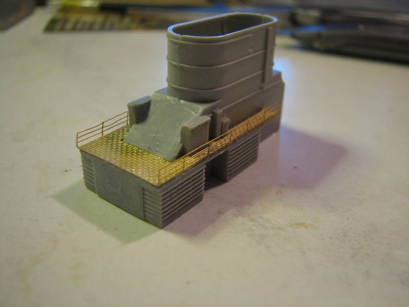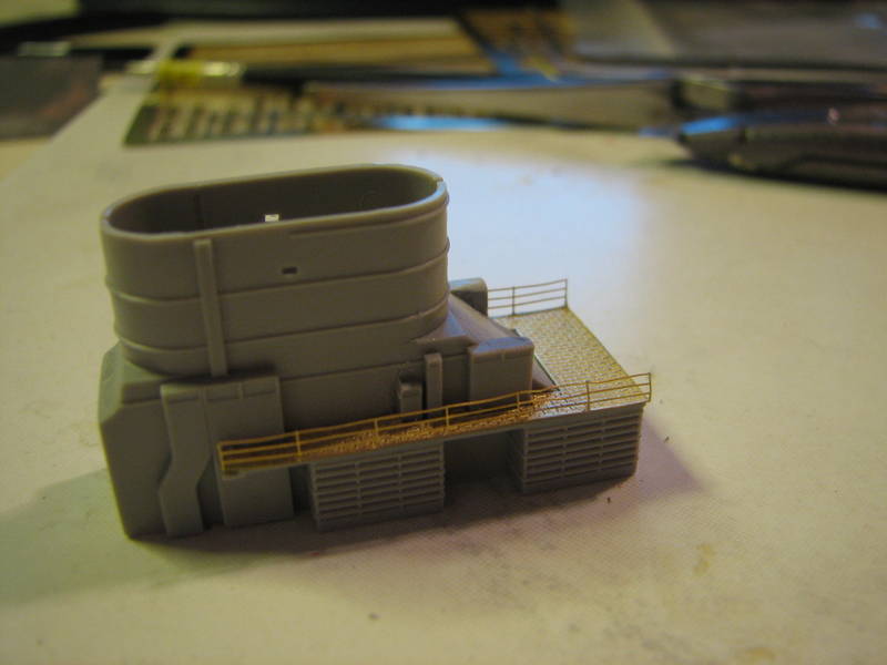 The fit was not perfect around the funnel (some sanding/cutting of one of the vents (?) along each side of the funnel was necessary to make it fit). The railing proved on the one hand sturdier than expected, on the other hand bent really easily. That said, what a difference does railing make! And I am so glad I have switched to Gator Glue, as I have no idea how I would have gotten this piece installed relatively cleanly as I have now using superglue... It takes longer (in total I probably spent over 1 hour getting this part fitted) but one can at least fit the part in stages and make adjustments....