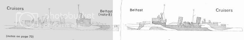 The first image is an original painting by Ross Watton and is the cover of his Anatomy of the Ship on BELFAST. The other two pages are from Peter Hodges' ROYAL NAVY WARSHIP CAMOUFLAGE 1939-1945.