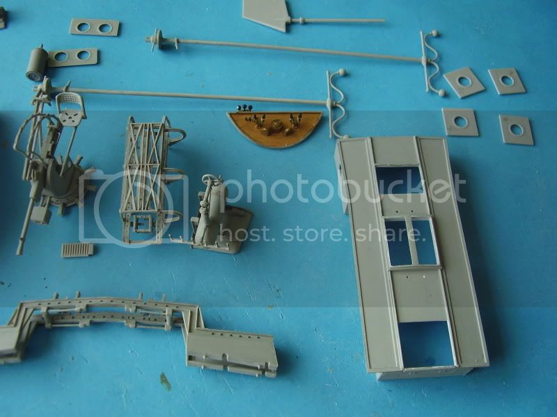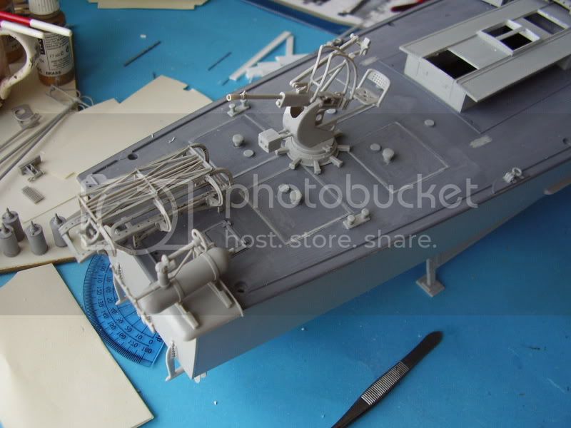Also worked on stage 33 the depth charges. There is a little spindle that rotates on the end of the rack - Parts 43f. One of these had a coulpe of stunted arms which didinl't help and the cross arm on my part 42d was broken off . Other than that a pretty good fit, I've som,e PE to add to thisp part yet