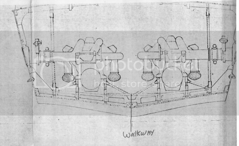 I also assume there was a central gangway running the length of the engine room, through the fuel tans to the workshop area, but this has some form of what looks like metal bracing between two sets of the tanks.