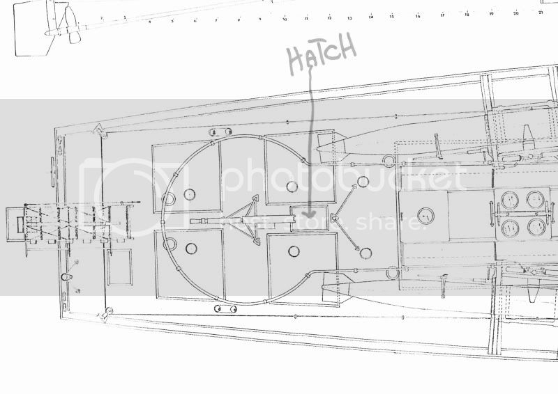 The only access to the fuel tank compartment was through the four hatches in the deck above and, on the drawings, what appears to be a small hatch on the centerline between the first two pairs of tanks. The hatch is not on the model, but I can see what looks like the appropriate framing for a hatch on the plans. It appears to be flush with the deck, so may have been more of a removable panel than a hinged hatch. It's about the same size as the hatch into the lazarette, but runs lengthwise. Its forward end is roughly in line with the back of the seat on the BREDA.. The bulkheads at either end did not have an access hatch through them.