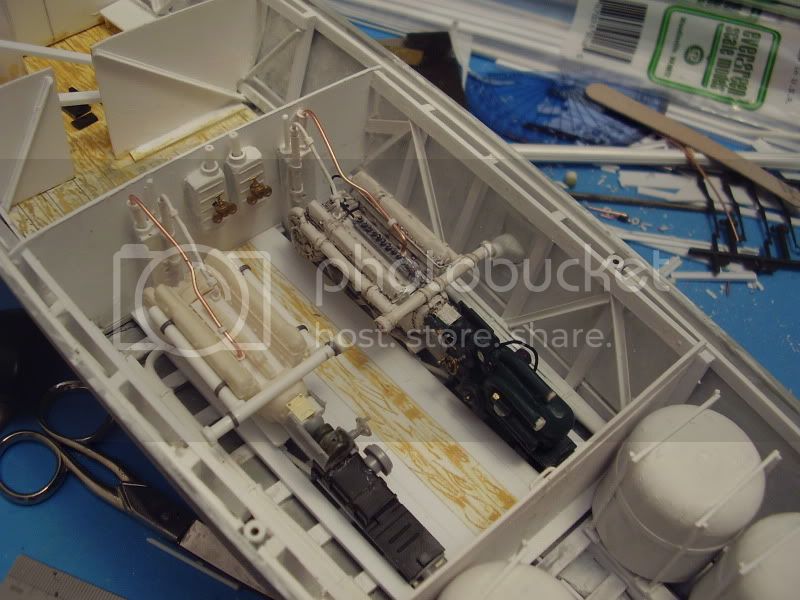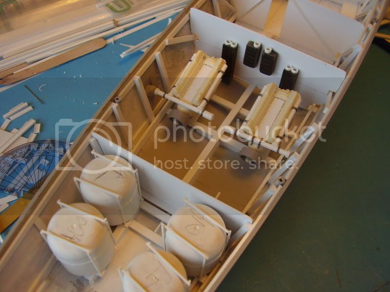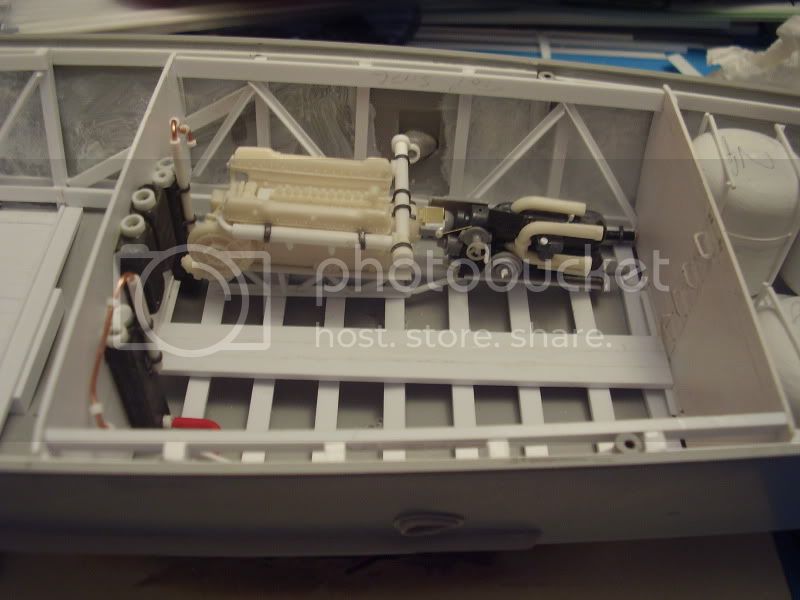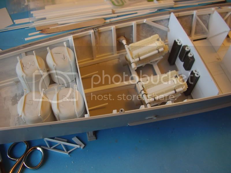 I don't have a lot of room for the cylinders and I haven't yet sources what I might use for them, but I'm thinking on that. Also wanted to put in a Bilge pump so I'll try and attach that somewhere near the aft end of the enging room with the pipe running up and out near the exhaust port. A small box and sledge hammer on the rear wall might fill it up a bit too, with a few tools around!