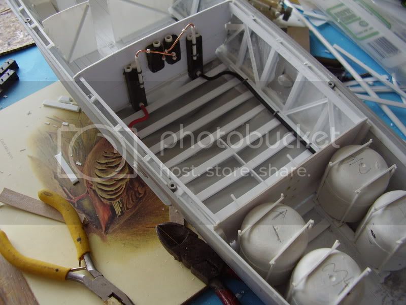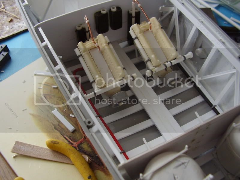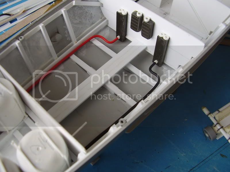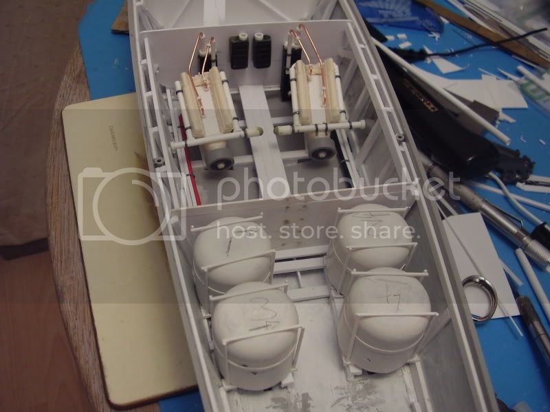 I use cable for the pipes, so I've attached it and secured it to some I beam Glued in the rear bulkhead and will finish the plumbing fittings on the forward bulkhead so I can fix it in,