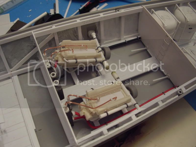 Once I've got all the piping from the forward bulkhead more or less ready to fit I can glue down front and rear bulkheads and add the bracing to the sides. Once that is done I can hopefully fit the main engine blocks and then work on the reducton gear thingi so lots to do yet.
