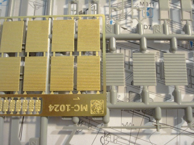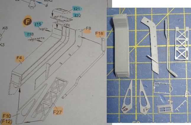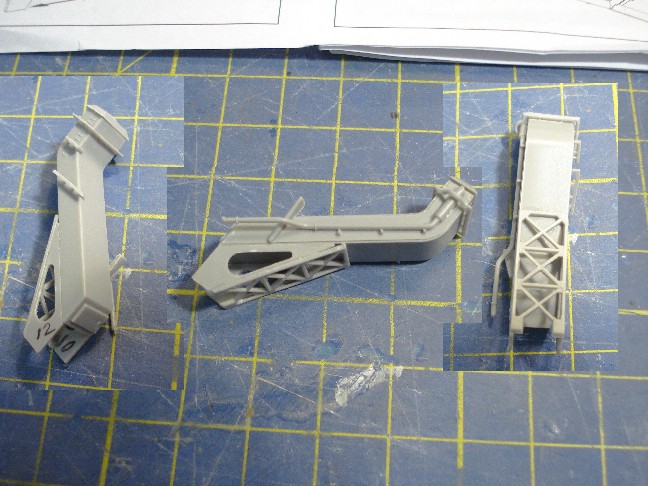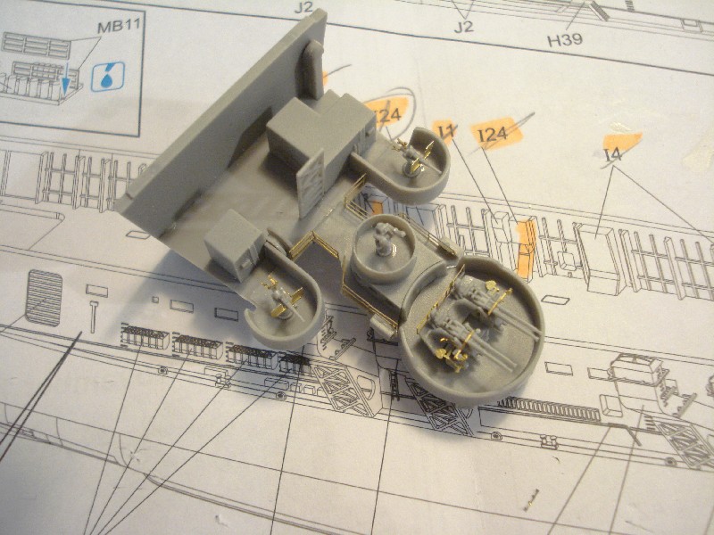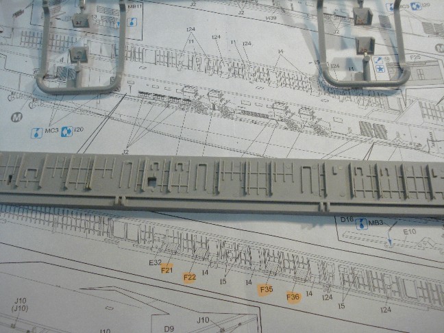 Going on to the hangar deck, be sure to have some kind of system with the instructions. They are so crammed it's easy to lose track of what's fitted and what not. I mark the numbers I have fitted already. Also note all the pin marks on this part. They won't be that evident if you don't mount a light inside the hangar but some may wish to remove them which is hard to do.