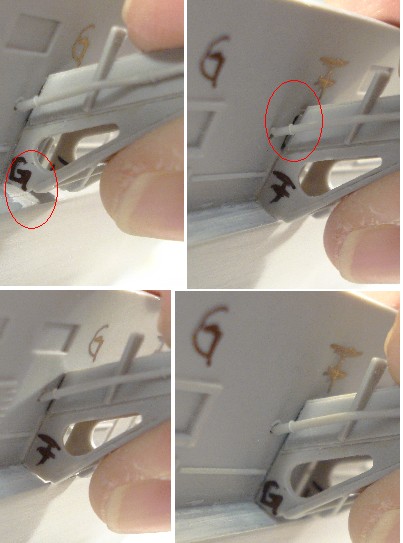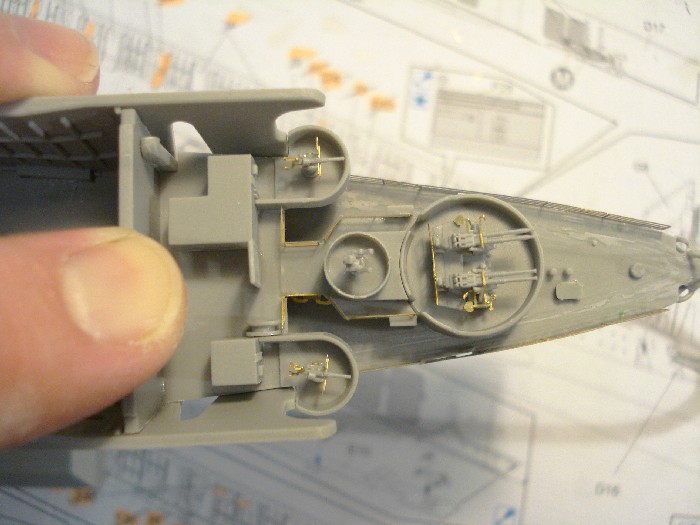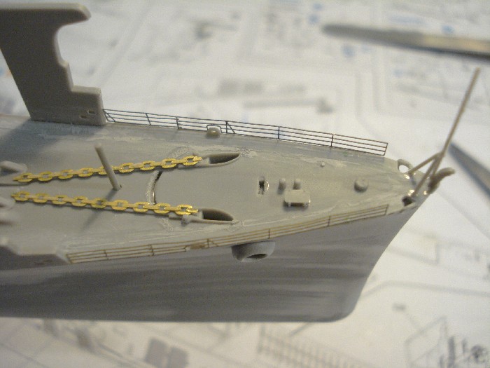Detail shot of the bow. There is some damage from the sprue attachment where DML removed the sprue from the upper hull. These will not be covered and have to be filled.