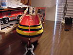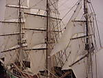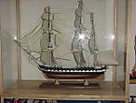 Here's the USS Constitution.  This is a wood model, I think it was produced by American Scientific.  This kit was a Christmas present (mid to late 70's), and I didn't start building it until about 1987.  I wish I had taken a bit more time on carving the hull, but you live and learn.  I had built the first display case shortly after I built the ship, and it had been in storage for about 5 years.  So I got it out of storage, stuck it in our new home, and there it sat for a couple more years.  Then, we bought another new home, and in the process of moving in, I had the dispay case (with ship inside) sitting on a wheelbarrow, because I was going to take it around to the basement door.  Well, I walked away for a minute, and I heard something like the tinkling of chimes or something.  When I got back to wheelbarrow, a sudden gust of wind had knocked the case out of the wheelbarrow, and the tinkling I had heard was the glass breaking!  Arrrrrrggggghhhhhh!  So for many years, the broken case and the broken ship sat in the house, until I finally got motivated to re-build the case and fix the damage to the ship.  In the picture, the display case sits on top of a bookshelf - there's about an inch of space between the ceiling and the case.