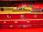 Here's the port side gunwale. Again, there has been touch-up painting done since the photo was taken. The unpainted light brown/tan part of the hull, just below the uppermost gun ports, is a ledge for the deck to fit into. The "notch" that is seen is the pocket where cross-member deck supports will fit in. You can see the same notch, or pocket, below the second row of gun ports. There are 5 or 6 crossmembers per deck. And let me vent here a bit: The crossmembers are moulded in red plastic, yet the instructions say to paint them white. So the question is, why in the world didn't they mould these parts in white plastic, instead of red? was red styrene pellets on sale that week?