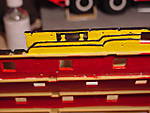 This next pic is of the moulding detail on the gunwale of the starboard hull half. I've had to go back and forth several times with black paint and then yellow paint to get the detailing correct - so the finished mouldings actually look better now, than what is in the picture. At this point, I've also painted the inside edges of the gun ports.