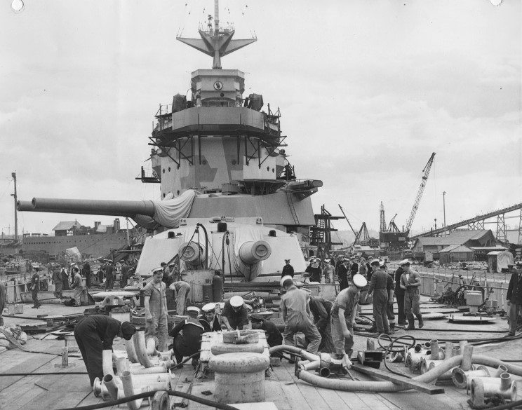 HMS Warspite possibly at the Puget Sound Naval Shipyard, Bremerton, Washington repairing battle damage in Aug. or Sept. 1941. To see the original high resolution photo, click here.