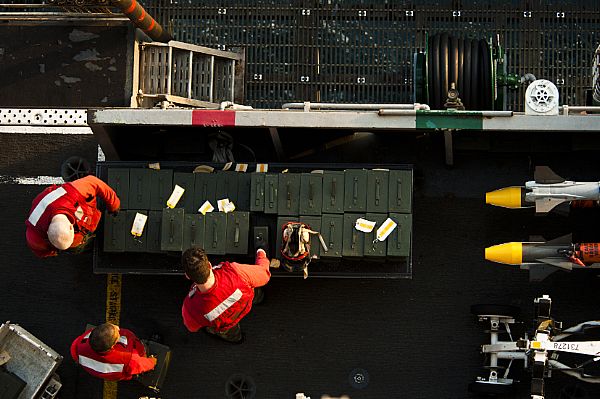 Aviation ordnancemen stack ammunition containers in the bomb farm aboard the Nimitz-class aircraft carrier USS John C. Stennis (CVN 74). To see the original high resolution photo, click here.