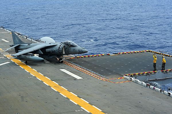 An AV-8B Harrier assigned to the Marine Attack Squadron (VMA) 214 taxis into position on the flight deck of the forward-deployed amphibious assault ship USS Essex (LHD 2). To see the original high resolution photo, click here.